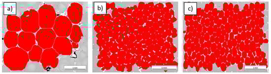 Detection of spheres in examined Cof—epoxy composites with different foam porosity: (a) Cof 20 ppi, (b) Cof 40 ppi and (c) Cof 60 ppi.