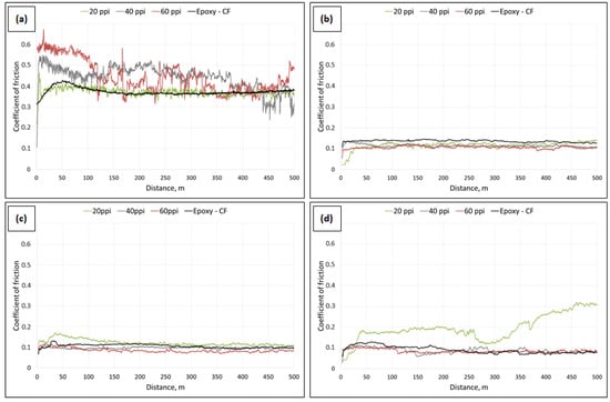 Coefficient of friction vs. sliding distance mean curves determined for neat epoxy and composites with carbon foams and carbon micro-fillers: (a) under 0.7 MPa load, (b) under 2.1 MPa load, (c) under 3.5 MPa load and (d) under 5.0 MPa load.