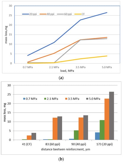 Correlation between mass loss vs. load (a) and mass loss vs. distance (b) between reinforcement carbon elements.