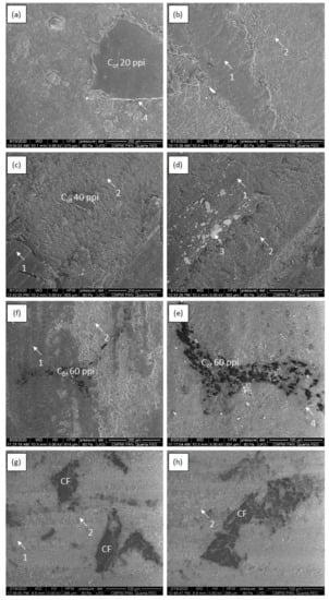 SEM micrographs of epoxy—Cof 20 ppi (a,b), epoxy—Cof 40 ppi (c,d),epoxy—Cof 20 ppi (e,f) and epoxy–CF (g,h) after cooperation with cast iron counter sample under 0.7 MPa load; 1—abrasive wear of carbon foam, 2—abrasive wear and adhesive shear and transfer of matrix, 3—solid tribofilm.