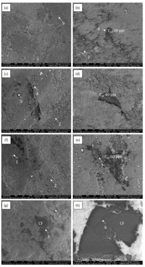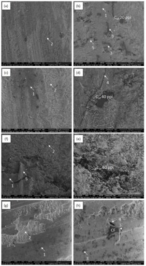 SEM micrographs of epoxy—Cof 20 ppi (a,b), epoxy—Cof 40 ppi (c,d),epoxy—Cof 20 ppi (e,f) and epoxy–CF (g,h) after cooperation with cast iron counter sample under 5.0 MPa load; 1—adhesive wear, 2—abrasive wear and adhesive shear and transfer of matrix, 3—solid tribofilm, 4—cracks at interface, 5—matrix delamination.