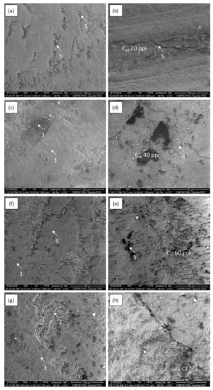 Figure 8, Figure 9, Figure 10 and Figure 11 shows SEM micrographs of the surfaces of the tested composites after cooperation with the cast iron counter-sample depending on the load in the friction node. The wear mechanisms change depending on the applied load and are dependent on the stereological parameters of the carbon components reinforcing the composites regarding the size of the foam pores diameters and the distances between the foam cell walls (Table 1). In the paper, the distance between the foam walls was characterized as the distance between the centers of gravity of the reinforcement elements (Lcf). In the case of the low-porous 20 ppi foam, greater distance between the foam particles (about 170 µm) contributes mainly to the wear of the matrix material. With increasing diameters of the reinforcement cells, the matrix destruction area decreases, and occurs only in the areas between the carbon particles. Such a mechanism is particularly visible in the case of the friction surfaces in composites tested under low load (Figure 8 and Figure 9). Increasing load causes the appearance of much larger areas of foam degradation and wear (Figure 10 and Figure 11). As the load increases, the wear mechanism of the foam also changes. In the case of a small load (0.7 MPa), it can be seen that the epoxy matrix deforms plastically, and its plasticized fragments are torn off and removed from the friction surface, or in the form of deposition of wear products, they form large adhesive areas on the surface connected with the matrix (Figure 8a and Figure 9a). The load increase causes the adhesively formed layers of wear products to be removed from the friction surface (Figure 10f and Figure 11f). Areas of thermal degradation of the matrix material can be seen in places where the wear products have detached. With a greater load on the surface of epoxy matrix in the place of friction, the formation of wear products from the degradation of glassy carbon was observed. Carbon wear products bond adhesively to the friction surface limit the direct contact between the cast iron and the composite, creating a thin layer (carbon tribofilm) on the friction surface. This leads to a change in the type of materials cooperating in the friction node. In this case, the cast iron pin cooperates not with the epoxy-carbon layer but with the carbon layer, and the low value of the friction coefficient of the carbon material causes significant reduction of the friction coefficient (Figure 6) and the wear of the composite (Figure 7). The formation of a friction-friendly tribofilm (solid lubricant layer) on the surface of the composite is largely dependent on the structure of the reinforcing foam. In the case of low-porosity foams, the cell walls are much thicker than those of high porosity foams. The glassy carbon used in the composites is characterized by high hardness, which contributes to the reduction of wear. On the other hand, the low shear strength of carbon walls makes for the fragmentation of glassy carbon particles and the formation of thin layers of tribofilm. However, in order to obtain adequate glassy carbon fragmentation, an increase in the load in the friction process occurs, predisposing to the cracking and fragmentation of particles and the formation of carbon wear products. With low porosity of foam, greater distance between the particles and greater cell wall thickness of the foam, the load of 0.7 MPa is too small for glassy carbon degradation to occur. At a low load (0.7 MPa), only the appearance of small cracks and delamination of the matrix material was observed (Figure 8a,c). However, when the load is increased to 2.1 MPa (Figure 9), the surface after cooperation is smoother, which indicates the formation of a solid tribofilm. Locally, crumbled glassy carbon particles and cracks at the interface in the epoxy composite were detected. The load of 3.5 MPa and 5.0 MPa (Figure 10 and Figure 11) contributes to the increase in the degree of degradation and fragmentation of glassy carbon, it causes an increase in the number of cracks and the appearance of fine crushed carbon particles in the foam walls. The confirmation of the influence of the size of the load on the destruction of the glassy carbon structure are the results of the tests of the composite containing CF foam with closed porosity (Figure 8h). The large carbon particle only cracked under pressure and did not fragment into smaller grains.