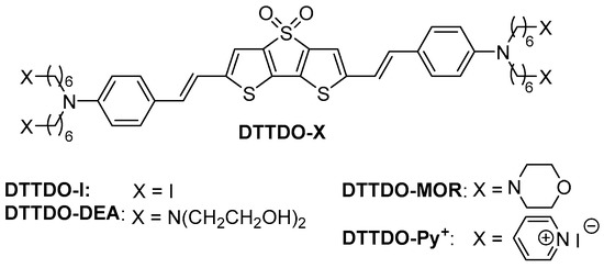 In the present manuscript, we report a concise and efficient synthesis of a new class of dithieno [3,2-b:2′,3′-d]thiophene 4,4-dioxide (DTTDO) derivatives as highly selective fluorogenic red emitting plasma membrane probes (Figure 2). These compounds have a D-π-A-π-D architecture, where electron-donating dialkylaminophenyl groups (D) are connected with a strong electron-accepting DTTDO moiety (A) via a conjugated π linker. To ensure water solubility and simultaneous electrostatic interaction with a polar inner and outer part of the plasma membrane, DTTDO fluorophores are equipped with hydrophilic groups X at both ends. The distance between these terminal groups is about 3.6 nm and it roughly corresponds to the thickness of the phospholipid membrane. Investigation of the optical properties, cytotoxicity determined against selected human cell types, and the application of DTTDO fluorophores to plasma membrane staining in living cells, are also presented.