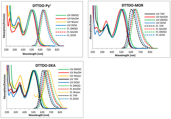 To determine the optical properties of the DTTDO derivatives their UV-VIS and fluorescence spectra in five solvents of different polarity (water, DMSO, MeOH, THF, and DCM) were recorded. Stokes shift (∆λ), fluorescence quantum yield (Ф), as well as absorption (λabs) and emission (λem) maxima of these compounds, are shown in Table 3 while Figure 4 presents their normalized fluorescence and UV-VIS spectra.