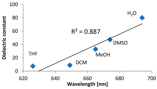 As all of the investigated compounds have a permanent dipole moment due to the presence of a strong electron-withdrawing sulphonyl group, it could be expected that absorption and emission spectra could be affected by the solvent polarity. While in the case of UV-VIS spectra such a relationship was not seen, for emission spectra a bathochromic shift of λem to a longer wavelength was observed with an increase of the solvent dielectric constant (Figure 5).
