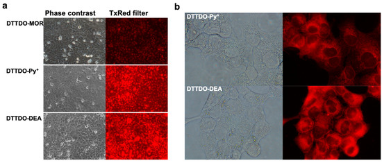 Intercellular fluorescence of DTTDO derivatives in living human keratinocytes (a) and squamous carcinoma cells (b) after incubation under standard cell culture conditions in a complete medium containing FBS and antibiotics. Compounds concentration 10 µM, incubation time—24 h. Left panel—phase contrast, right panel—fluorescent images with TxRed filter (λex = 540–580 nm, λDM = 595 nm, λBA = 600–660 nm). Magnification and exposure time: 10×, 600 ms for (a) and 60×, 2 s for (b), respectively.
