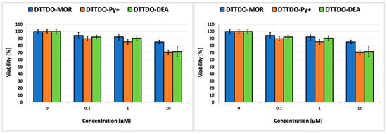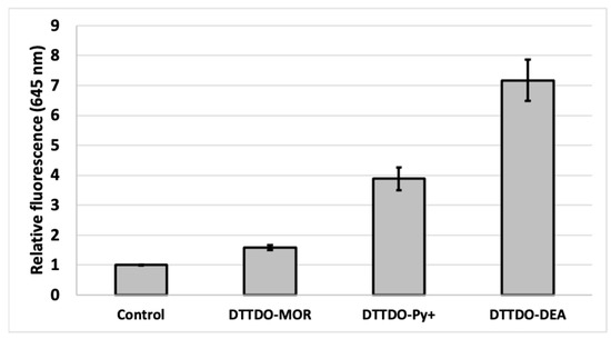 While the obtained results showed efficient staining of cell structures with an inconsiderable medium background for all tested DTTDO derivatives, the intensity of fluorescent signal inside the cells differed depending on the compound. Among all tested dyes, the lowest fluorescence intensity was observed for DTTDO-MOR. Both the remaining compounds demonstrated strong labeling of cells. To quantify the intracellular fluorescence signal, additional fluorescence intensity measurements were performed. For this purpose, the compounds were added to cell cultures and incubated in standard conditions for one hour in a complete medium. Before the measurements, the cells were washed twice to eliminate the background error and ensure, that obtained fluorescence value represented the signal from the cells. The obtained data confirmed the results from microscopy observations, indicating DTTDO-MOR as the least effective among the tested dyes, and DTTDO-DEA as the most efficient one (Figure 7). Furthermore, the results revealed, that a one-hour incubation is sufficient to observe the fluorescent signal from all the tested compounds inside living cells.