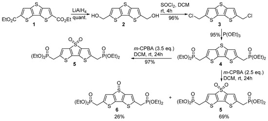 The synthesis of DTTDO derivatives started with commercially available diester 1 (also simply accessible from thiophene via a known three-step procedure [45]) (Scheme 1). The reduction of diester 1 with LiAlH4 followed by chlorination of crude diol 2 formed with an excess of thionyl chloride gave dichloride 3 in 96% overall yield. Heating of compound 3 with an excess of P(OEt)3 resulted in the formation of bisphosphonate 4, which in the next step was subjected to the oxidation reaction with 3.5 eq of m-CPBA at room temperature. The oxidation process proceeded in a highly regioselective manner to afford as a sole product sulfone 5 in 97% yield. When the same reaction was conducted with a smaller excess of m-CPBA (2.5 eq), next to sulfone 5 sulfoxide 6 was isolated in 26% yield.