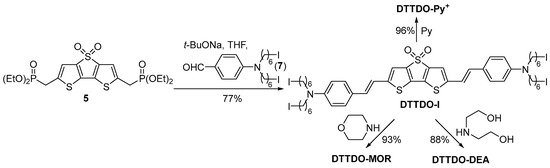 The reaction sequence leading from bisphosphonate 5 to DTTDO-based dyes is presented in Scheme 2. The key intermediate DTTDO-I was prepared in the Horner-Wadsworth-Emmons olefination reaction of bisphosphonate 5 with aldehyde 7. Next, the transformation of four terminal iodide groups in DTTDO-I into the corresponding quaternary ammonium salt DTTDO-Py+ was achieved by treatment of DTTDO-I with an excess of pyridine. DTTDO-MOR was obtained in the nucleophilic substitution reaction of DTTDO-I with morpholine. A similar reaction of DTTDO-I with bis(2-hydroxyethyl)amine afforded DTTDO-DEA in 88% yield.