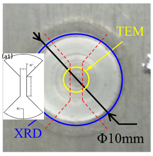 The specimen was prepared by etching in Keller’s Reagent (5 mL HF; 3 mL HCl; 5 mL HNO3; 190 mL H₂O) for 15 s. The microstructure was observed using a Leica DFC−295 optical microscope. The grain size of each specimen was measured using Image Pro−Plus software. The precipitates were subsequently observed on a JEM 2100F TEM (transmission electron microscope), using the region cut from the center of each specimen. Quantitative XRD measurements were performed with a D/max2200 PC X−ray diffractometer equipped with a scanning step size of 0.02° and a scanning speed of 3 °/min. Vickers hardness testing was performed on the machined surface of the joint, using an HXZ−1000 Hardness tester with a load of 200 g and a dwelling time of 15 s. A tensile test was performed on an Instron−8801 tensile tester at room temperature under an initial strain rate of 6.7 × 10−3 s−1. The dimension distance of the tensile specimens was 3 mm, the width was 1 mm (Figure 1), and the tensile properties of the specimens were tested three times. The fractography of the tensile specimen was observed using CS−3400 SEM device.