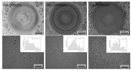 Figure 2 shows the optical micrograph and the grain sizes of the as−received specimens from the FSpW joint of the 2098−T8 Al−Li alloy. It can be observed from the macro−graph that the FSpW joint exhibited a circular zone. Its size is the same as the corresponding mixing tool and exhibited a smooth surface. Figure 2a displays a process of the specimen using a composite tool at a rotating speed of 500 rpm with a grain size of 9.1 μm. It is evident that Figure 2b showed the progress of grain refinement on the specimen, and the statistical results presented a single peak distribution of the average grain size of 9.8 μm. Figure 2c exhibits the image of the as−received specimen using the rotating speed of 1800 rpm. It can be observed from the pattern that the grain refinement process happens, the average grain size is 12.5 μm. Results show that the original “pancake” grains in the 2198−T8 Al−Li alloy can be transformed into the fine equiaxed grain and grow with the increase of rotation speed (500~1800 rpm).