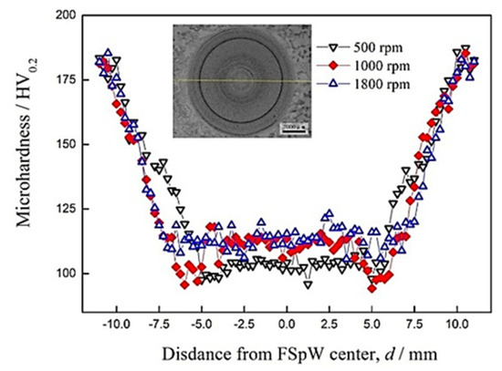 Hardness distribution of FSpW 2198−T8 Al−Li alloy at different rotational speeds.