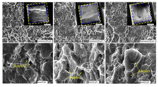 Figure 8 shows the SEM images of the fracture surfaces of the ordinary 2198−T8 Al−Li alloy. As can be seen from Figure 8a, the fracture section was reduced and the necking phenomenon occurred in the tensile process, with the evidence of secondary cracks and deep dimples along the fracture surfaces. Figure 8b displays an enlarged picture of the dimple. The dimple was equiaxed in which there were broken particle phases. The results show that the fracture mechanism of the basic 2198−T8 Al−Li alloy is a quasi−cleavage fracture and the fracture mode is a ductile–brittle mixed fracture.