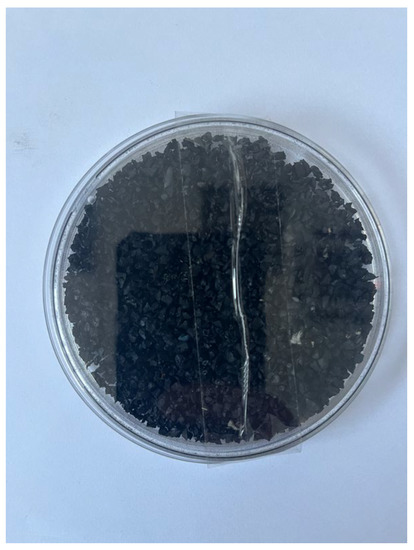 Rubber granulate (Figure 2) from the grinding process of belt conveyors, which is a waste based on various rubbers (mainly Styrene–Butadiene Rubber, (Unirubber Ltd., Węgliniec, Poland)), was used to prepare the samples. Table 2 shows the basic properties of the granulate.