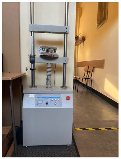 Strength tests were performed in accordance with the guidelines of EN 196-1:2016 [37]. Flexural strength was carried out on a SAUTER testing machine, (CR 30000-1Q1, Sauter, KERN&SOHN GmbH, Balingen, Germany (Figure 3). It should be noted that only cylindrical samples were selected for strength tests. The samples were placed on the supports with the lateral surface in the center of the measuring device disc and uniformly loaded with a force of 2400 ± 200 N·s −1 until the sample was destroyed. The compressive strength test was carried out using the same device and, in accordance with the guidelines of the standard, half of the samples obtained during the bending strength test were used. The samples were broken without damaging the structure. The tested object was placed between the compression plates in the longitudinal direction. The load increment was set, as before, to a force of 2400 ± 200 N·s −1.