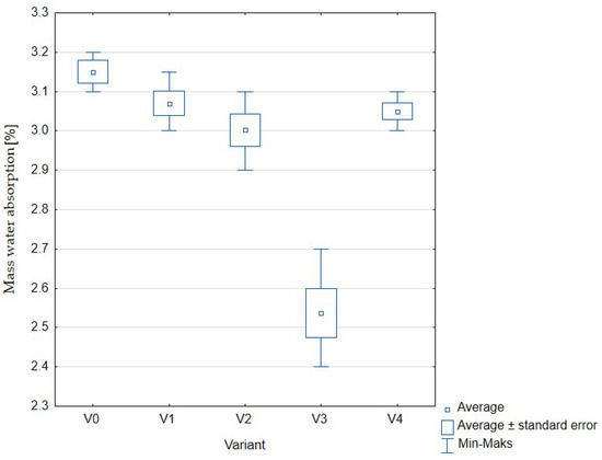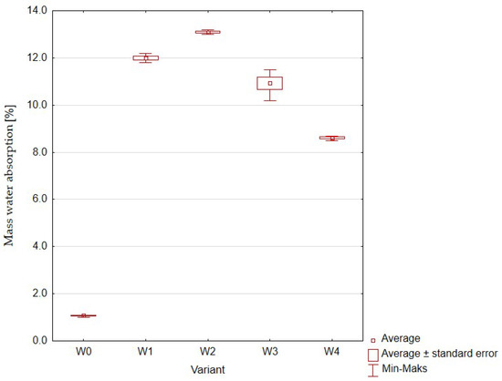 The results obtained for the measurements of mass water absorption, broken down into the variants described above, are presented in Figure 6, Table 3.
