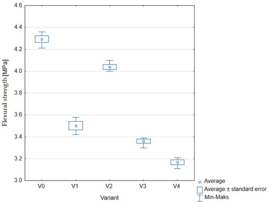 The obtained results were statistically significant and average values ranged from 4.27 to 3.20 MPa. It should be noted that in all variants, the differences for subsequent repetitions were small, as shown by the lines showing the minimum and maximum values for each result. The additions of hydrated sewage sludge had a negative effect on the flexural strength of the prepared concrete. Increasing the share of sludge as a water substitute resulted in a decrease in the obtained values, although for one variant, in which water and sludge accounted for 50% each, the obtained result was close to the value obtained in the case of the control sample (variant V1).