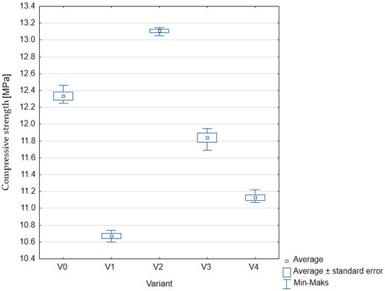 The obtained results were reproducible and statistically significant. Despite this, even for the control sample, the declared strength of 16 MPa or more was not obtained. When analyzing only those variants in which sewage sludge was added (V1–V4), similarly to the flexural strength test, the use of a sewage sludge to water ratio of 1:1 brought the most satisfactory results. This means that for variant V2, the compressive strength was the highest and even exceeded the value obtained for the control test (V1). The use of other proportions resulted in a decrease in the tested parameter in relation to the sample without the addition of sewage sludge.