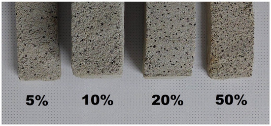 In a given series of tests, cement mortar was mixed with water, but an additive in the form of rubber granulates was used. As in the case of the first series of tests, five variants were prepared in which the mass share of rubber in the entire concrete mix was changed. In order to simplify identification and clearly distinguish variants within both groups, the designations W0–W4 have been used for a given series. The subsequent variants were as follows (Figure 9 and Figure 10): W0 (control, 0% rubber additive); W1 (5% rubber additive); W2 (10% rubber additive); W3 (20% rubber additive); W4 (50% rubber additive).