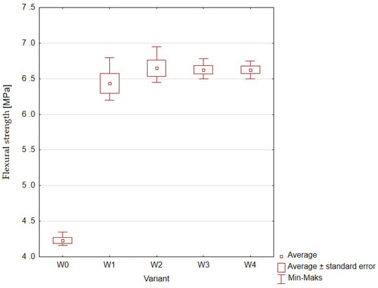 Figure 7 (Table 4) shows the flexural strength of individual samples expressed in MPa. This parameter, in contrast to compression, is not usually defined in relation to concrete. However, it seems essential from the point of view of some technical applications, for example: concrete floors [26].