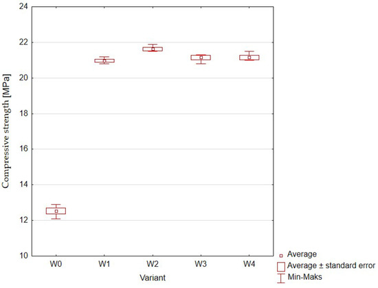 Compressive strength of concrete with the addition of rubber granulates: W0 (control, 0% rubber additive); W1 (5% rubber additive); W2 (10% rubber additive); W3 (20% rubber additive); W4 (50% rubber additive).