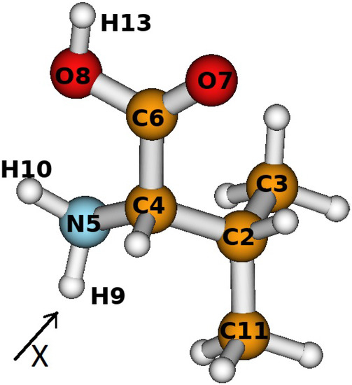 In order to model the results of the fragmentation processes obtained in the experiment of [12], we performed a theoretical investigation of valine with the inclusion of an electric dipole field in the x direction (see Figure 1). The theoretical approach is described in detail in our previous publications [9,12]. We used the most stable conformer of valine, along with optimization without any symmetry constraints, e.g., where all bonds length, angles and dihedral angles are changed. We implemented the Becke’s three-parameter hybrid functional approach with non-local correlation, provided by Lee, Yang, and Parr () [18,19,20], - basis set. The calculations were performed using the GAUSSIAN09 package [21], with and without the dipole electric field influence, adding also the magnetic field contributions. The latter was implemented by using two modified basis sets, the first one in which both the s- and p-orbitals were modified by the magnetic field, and the second one in which the correction coefficients, and , which we calculated in Section 2.3, entered only the wave functions of the p-orbitals. The significant difference in the shape of the valine conformer under study was foreseen at a dipole magnetic field strength of a.u. Thus, the comparisons of the geometric parameters, such as bond length, angles, and dihedral angles, were performed at exactly this strength of the electric field. The obtained results are presented in Table 1.
