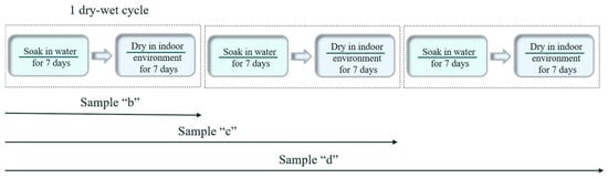 The MOC samples that were cured in an indoor environment for 28 days were soaked in distilled water for 7 days and then taken out and dried naturally in an indoor environment (temperature 23 ± 2 °C, humidity 40 ± 2%) for 7 days. This was a dry–wet cycle period (14 days in total). Sample “b” experienced 1 dry–wet cycle, and sample “c” experienced 2 dry–wet cycles, which lasted 28 days. When the samples were subjected to 3 dry–wet cycles, they were named as “d”, totaling 42 days. By that time, the samples had already been seriously warped and deformed, and the dry–wet cyclic test was stopped. The dry–wet cyclic experiment as well as the corresponding sample labels are presented in Figure 2.