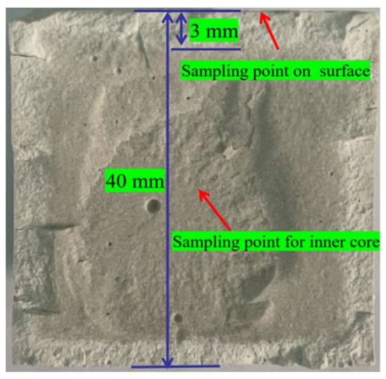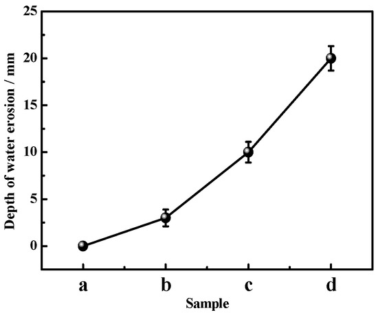 Additionally, a Vernier calliper was used to measure the water erosion depth in the cross-section of the sample, and the sampling point was marked (Figure 3). For example, the water erosion depth of sample “b” was found to be 3 mm.
