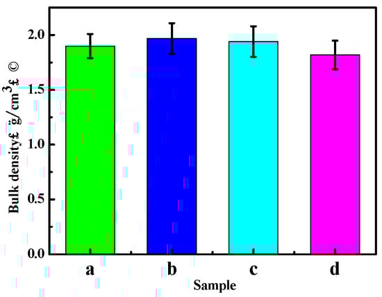 A CP513 electronic balance was used to test the quality of the MOC samples after different dry–wet cycles. As for each scheme, i.e., samples “a”, “b”, “c”, and “d”, 6 parallel specimens were taken, and each specimen was weighed 5 times. The obtained average value M (unit: g) was the mass of the samples. Depending on Equation (1), the bulk density (g/cm3) was calculated, in which 256 was the sample volume (cm3).