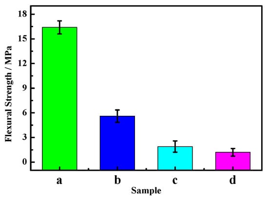 Flexural strength of the MOC samples after different dry–wet cycles: (a) without dry–wet cycles; (b) one time; (c) two times; (d) three times.