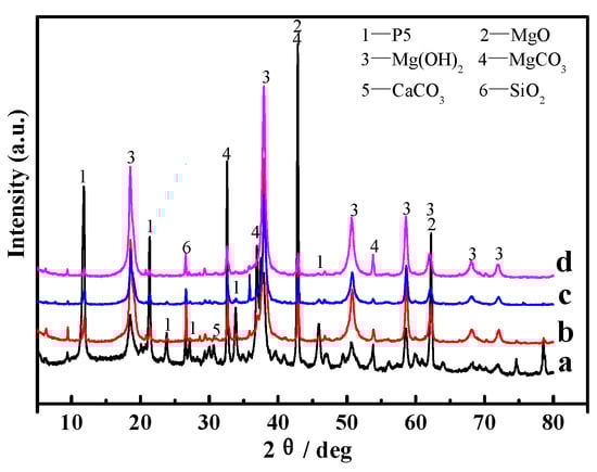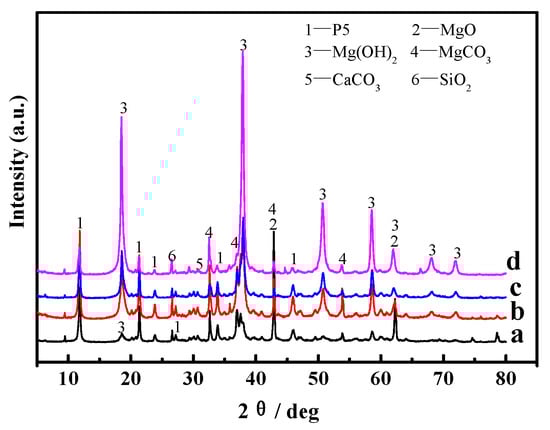 The XRD patterns of the inner cores of samples “a”, “b”, “c”, and “d” are displayed in Figure 11. It can be seen from Figure 11 that the P 5 in samples “a” and “b” barely change, but the MgO diffraction peaks in sample “b” slightly decrease, while the Mg(OH)2 diffraction peaks increase. With increasing dry–wet cycle numbers, the content of P 5 and the MgO phase in the sample gradually reduce, while the content of the Mg(OH)2 phase further augments, as shown in Figure 11c,d. Among them, the MgO content in sample “d” reduces to zero, and the content of the Mg(OH)2 phase is close to that in the outer layer (see Table 3). Both the inner and outer layers of sample “d” are mainly composed of Mg(OH)2, which indicates that water molecules completely enter into the inner core of the sample, giving rise to the change in the main phase composition. While P 5 is the major strength phase, a decrease in its content will inevitably lead to a decline in the mechanical properties of MOC materials, as shown in Figure 7 and Figure 8.