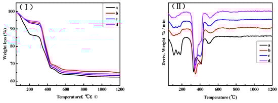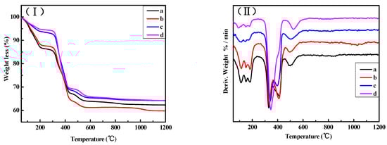TG curves (I) and DTG curves (II) of the inner cores of the MOC samples after different dry–wet cycles: (a) without dry–wet cycles; (b) one time; (c) two times; (d) three times.