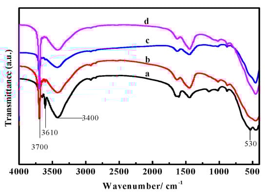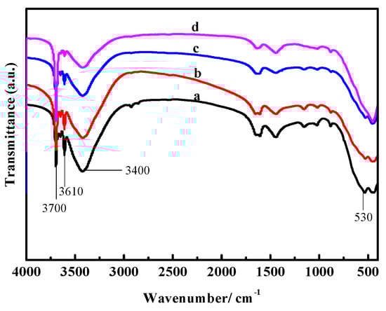 Figure 15 shows that the peaks near 3670 cm−1 and 3610 cm−1 in samples “a” and “b”, respectively, are stronger than those in samples “c” and “d”, indicating less P 5 content in samples “c” and “d”. The peaks at 3700 cm−1 in samples “c” and “d” are stronger compared with samples “a” and “b”, especially in sample “d”, indicating that the content of Mg(OH)2 in sample “d” is larger. As Figure 14 and Figure 15 show, after three dry–wet cycles, water molecules reach the inner core of the sample, causing the transformation of the overall phase of the sample.
