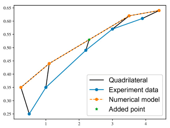 A real-valued function known as SM quantifies how similar two objects are to one another. In our case, measuring the similarity between two curves in a 2D space. The algorithm used was proposed in this paper by C. F. Jekel and others [24] (Figure 4). Two curves that are being compared require the same number of points in order to construct quadrilaterals to approximate the total area between the curves. If one curve has fewer data points than the other curve, data points are added until both curves have the same number of data points. It was chosen to add rather than remove points to avoid any loss of information for general problems. While there are many ways to add artificial data points to the curve, a simple approach was taken which adds an artificial data point by bisecting two points. The location for the bisection was chosen based on the largest Euclidean distance between two consecutive points. Points are added to the curve in this fashion until both curves have the same number of points [24].
