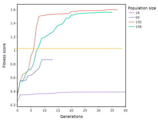 Impact of population size on the GA’s performance. Higher population sizes show better performance in terms of the fitness score. The population size of 150 shows the best results.