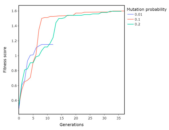 Mutation probability contributes to parameter space exploration. Too low a probability and the GA becomes stuck in a local minimum, too big and it is not able to narrow down on the optimum. Out of the tested mutation probabilities, 0.01 performed the worst; a higher value of 0.1 yielded better results. Further increasing the probability to 0.2 did not have any significant impact on performance (Figure 6).