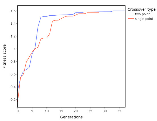 The main difference between single and two points crossover is that two points can explore the parameter space faster at the cost of breaking up more of the genetic sequence. For some problems, disrupting genetic sequence too much can impact the GA’s performance. However, in this case, two point- and single-point operators performed similarly (Figure 7).