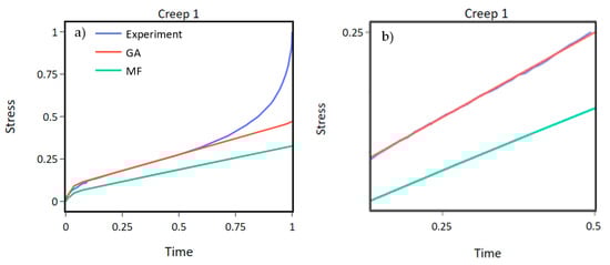 Creep 1 (Figure 8a) and the tensile experiment (Figure 9) demonstrate the best and worst performing cases when comparing the GA and MF methods.