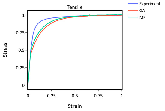 The GA and MF methods compared to the experimental tensile curve. The MF method outperforms the GA.