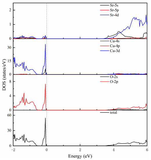 To study the electronic properties of SrCu2O2 more deeply, the corresponding electronic total and partial density of states within the HSE hybrid functional calculations were further investigated and are shown in Figure 3. The electronic states near to the top of the valence band are mainly contributed to by Cu-3d and O-2p electrons. The sharp peak indicates that these electrons are localized at these energy levels. The states around the bottom of the conduction band are mainly composed of Sr-4d and Cu-3d, as well as O-2p electrons. What is more, the strong hybridization between Sr-4d and O-2p in the SrO6 octahedron and the bonding interactions of Cu-3d and O-2p in the O-Cu-O dumbbell-like structural units could be considered as the essential reasons for the structural stability of the SrCu2O2 system.