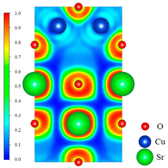 Calculated electron localization function (ELF) for the (010) plane across Sr, Cu, and O atoms.