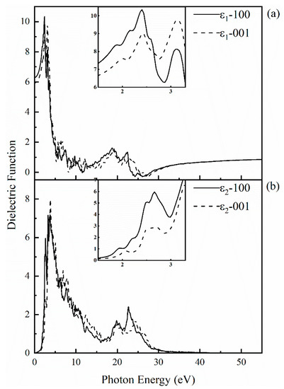 Calculated complex dielectric function for SrCu2O2: (a) the real part along the (100) and (001) directions; (b) the imaginary part along the (100) and (001) directions. The insets present the obtained data for the real and imaginary parts of the dielectric function in the visible light region (1.5–3.3 eV), respectively.
