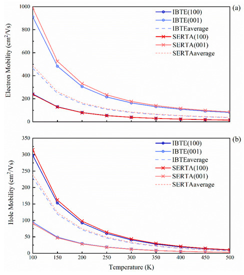 The calculated drift carrier mobility of SrCu2O2 as a function of temperature is shown in Figure 7, with the carrier concentrations all set to 10−13 cm−3. At a low temperature, the carrier mobility obtained by IBTE slightly differs from SERTA. However, as the temperature increases, the calculated values tend to be consistent. At room temperature, the average of the electron and hole drift mobilities obtained by IBTE are 80.6 cm2/Vs and 31.3 cm2/Vs, respectively, while those obtained by SERTA are 84.5 cm2/Vs and 33.0 cm2/Vs, respectively. Moreover, the mobility of electrons along the (001) direction is much higher than that in the (100) and (010) directions, while the situation of the holes is exactly the opposite, which is consistent with the results of effective masses. The ratios of average mobility of electrons to holes are always greater than 2, which explains the high separation efficiency and low recombination rate for the photogenerated electrons and holes.