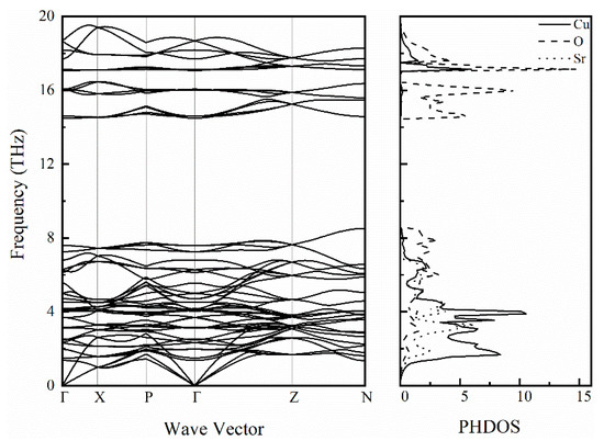 To further study the lattice dynamics of SrCu2O2, the phonon dispersion curve along high symmetry directions and the corresponding phonon density of states were calculated as shown in Figure 8. There are 20 atoms in a unit cell of SrCu2O2, thus there are 60 branches in the phonon spectrum, including 3 acoustic branches and 57 optical branches. There is no imaginary frequency in the calculated phonon spectrum, showing the good dynamic stability of SrCu2O2. The acoustic branches reflect the vibration of the primitive cell’s centroid and occupy the 0~2.8 THz frequency region. Furthermore, for the acoustic branches through Γ, the frequency of the longitudinal modes is higher than that of the transverse modes. In addition, there is no separation between the longitudinal acoustic branch and the transverse optical branch around 2.8 THz, indicating that the transition from the acoustic mode to the optical mode does not require any momentum transfer [43]. Combined with the phonon density of states, the coupling vibration of Sr, Cu, and O atoms is mainly manifested below 8.6 THz, especially in the frequency range of 1.2~7.0 THz, which shows a difference between the coupling vibration of Sr-O and Cu-O. In the range of 14.4~16.6 THz, the phonon branch is basically attributed to the vibration of O atoms, while it is contributed to by the coupled vibrations of Cu and O atoms for 17.0~19.4 THz.