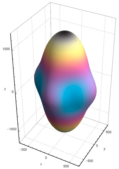 The anisotropy of shear elastic can be described by A = 2C66/(C11 − C12). Generally, A = 1 means that the material is elastically isotropic, and the farther the value of A is from 1, the more obvious the elastic anisotropy of the material. The calculated A of SrCu2O2 is 0.66, indicating that SrCu2O2 has significant elastic anisotropy. Moreover, the direction-dependent Young’s modulus directly determines the elastic anisotropy of SrCu2O2. The calculated direction-dependent Young’s modulus is shown in Figure 9. The elasticity of SrCu2O2 is relatively uniform in the x and y directions, while its anisotropy is mainly reflected in the z direction, whose value is about twice that in the x and y directions, which is consistent with the lattice parameters of SrCu2O2.