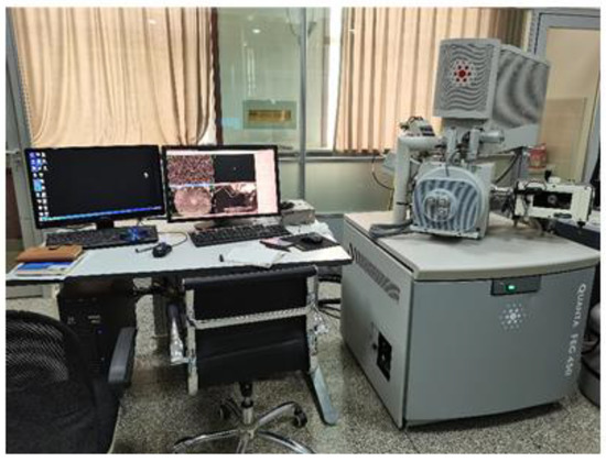 Small fragments of concrete specimens crushed in the compressive strength test were utilized for the SEM test. The samples were dried at ambient temperature, then placed in a gold spraying equipment to spray gold on a paste–aggregate interface, and finally placed in an SEM instrument to scan and observe the microstructure (Figure 6 and Figure 7).