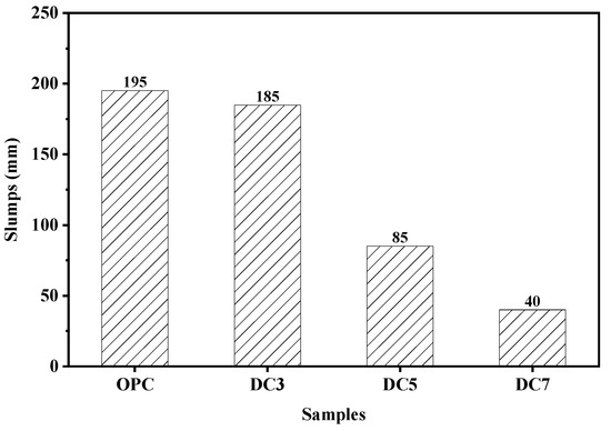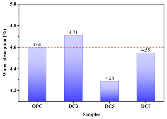 Figure 8 depicts the slump values of concrete samples OPC, DC3, DC5, and DC7. The slump value of the concrete mixture decreases gradually with increasing diatomite content, indicating that diatomite addition weakens its workability. Due to the pore structure of diatomite particles (Figure 3), it can absorb free water from the concrete mixture. The greater the diatomite content, the less flowable the concrete mixture. Water absorption is an essential characteristic of concrete, as it is one of the most significant indicators of concrete’s durability. Figure 9 represents the water absorption of concrete samples OPC, DC3, DC5, and DC7; their water absorption is 4.60%, 4.71%, 4.28%, and 4.55%, respectively. These values indicate the presence of permeable voids in the concrete. The water absorption of concrete samples first reduces and then rises with an increase in the diatomite content. The water absorption of sample DC5 is the lowest, 0.32% lower than sample OPC. This demonstrates that adding diatomite to concrete affects its open porosity and compactness. A sufficient amount of diatomite can fill the pores in the concrete and make its structure denser, whereas an excessive amount of diatomite can cause concrete to dry and shrink, thereby creating more pores or voids and loosening its structure. Concrete with 5% diatomite content has the lowest open porosity, densest structure, and relatively good workability.