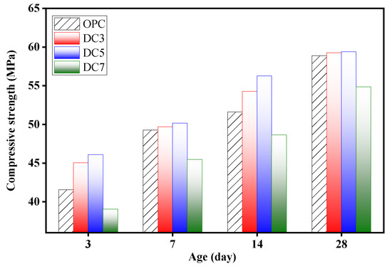 The compressive strength of concrete samples OPC, DC3, DC5, and DC7 at 3, 7, 14, and 28 days were tested, and the results are shown in Figure 10 and Table 4. During the same curing period, the compressive strength of the concrete samples initially increases and then decreases with increasing diatomite content as a replacement for cement in concrete. When the diatomite content is 5%, the compressive strength of the concrete sample reaches the highest. The compressive strength of DC3 is higher than that of OPC, but lower than that of DC5. In contrast, DC7 has a significantly lower compressive strength than OPC, DC3, or DC5. This indicates that when the diatomite content is less than 5%, the compressive strength of concrete can be improved, whereas when it is more than 5%, the compressive strength of concrete will be noticeably reduced. At three days of age, DC3 and DC5 have Aa values of 75.9% and 77.6%, respectively, which are higher than OPC with 70.6%. At 28 days of age, the compressive strengths of DC3 and DC5 are only 0.4 and 0.5 MPa greater than that of OPC. This demonstrates that adding 3% and 5% diatomite to concrete can accelerate the hydration reaction and raise its early compressive strength more effectively while having little effect on its late compressive strength.