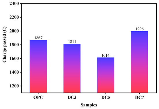 The resistance to chloride penetration (RCP) of concrete was tested by Coulomb electric flux test. Figure 11 illustrates that the charge passed of samples OPC, DC3, DC5, and DC7 is 1867, 1811, 1614, and 1996, respectively. The smaller the charge passed, the stronger the RCP ability. With the increase in diatomite, the RCP ability of concrete initially increases but then weakens. When the diatomite content is 5%, the RCP ability of concrete is the strongest. The penetration and migration of chloride ions in concrete can be reduced when the content of diatomite is less than 5%, indicating that the concrete structure becomes compact. When the diatomite content exceeds 5%, the compactness of the concrete structure decreases. DC5 has the densest structure and the strongest RCP capability. DC3 and DC5 have superior RCP abilities compared to OPC, whereas DC7 has significantly inferior RCP capabilities. This shows that excessive diatomite additions can seriously deteriorate the compactness of concrete and reduce its durability. Excessive diatomite in concrete causes it to dry and shrink, resulting in many pores and voids inside and outside.