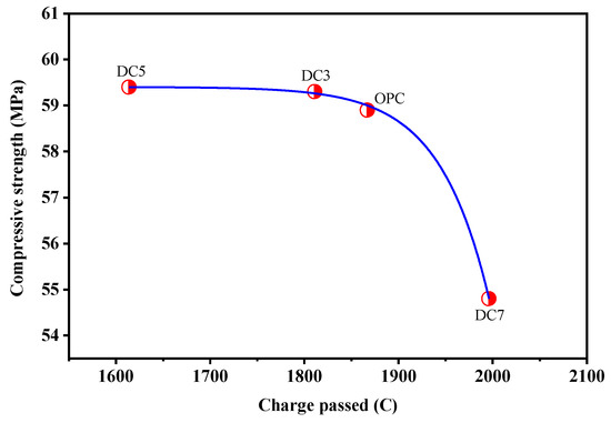 Figure 12 displays the relationship between the charge passed and the compressive strength of concrete samples. It indicates from the nonlinear fitting curve that the compressive strength of concrete decreases with the increase in the charge passed. Conversely, the higher the compressive strength of concrete, the smaller the charge passed and the stronger the RCP ability, demonstrating better durability. Therefore, the compressive strength of concrete can be utilized to predict its RCP ability, i.e., durability.